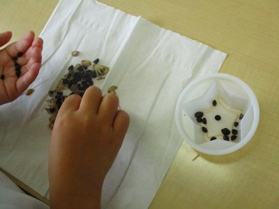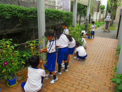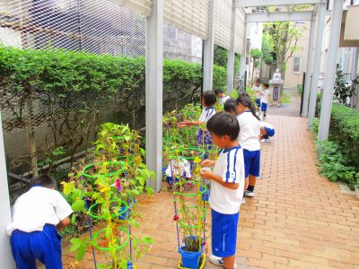 夏休み中も観察を続けたあさがおは、始業式の日、お家の方が玄関まで届けてくださいました。