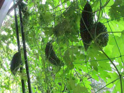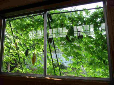 体育館の窓から外を見ると、ゴーヤが実っています。