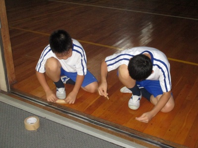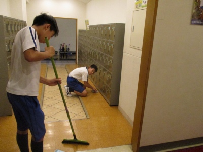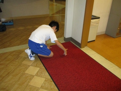 玄関マットと靴箱、体育館入口マットのお掃除をしているところです。