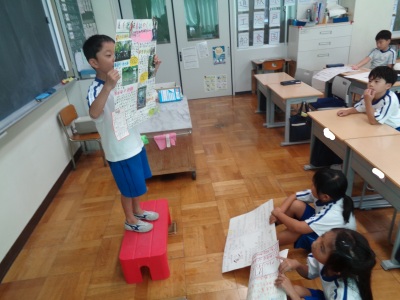 前時に仕上げたスピーチ原稿をもとに、研究したことや調べたこと、生き物などについて発表しました。