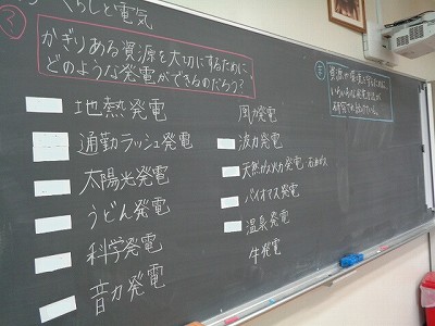 今日は、わたしたちのくらしと電気の学習を行いました。これまで、火力発電・水力発電・原子力発電など、わたしたちのくらしを支える電気は、どのように生まれてくるのかを学びました。しかし、発電には大きな資源が必要であり、環境問題への心配もつきません。そこで、第三次エネルギーと言われる、地球に優しい新しい発電について、現在発見されているものをみんなで調べ、発表し合いました。通勤ラッシュ発電や、うどん発電など、「何それ!?」という発電もたくさん挙がり、環境との共存を考え続ける大切さを学びました。