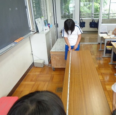 算数では、長さの学習に入りました。1回目の今日は、巻き尺を使って長さを測る練習をしました。