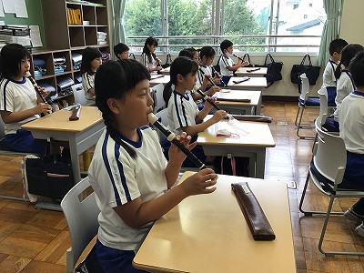 「♪地平線」という、静かに日が昇り日が落ちていく様子を表すようなイメージの曲です。“エア”で、指の動きを確認した後は、個人練習→列ごと→全体と、合わせ方に変化をつけて、学習を進めました。楽譜を見ないで吹ける曲のレパートリーに入れたいと考えてます。