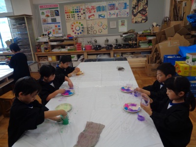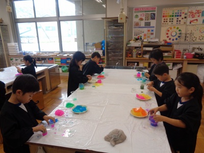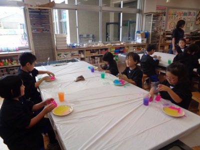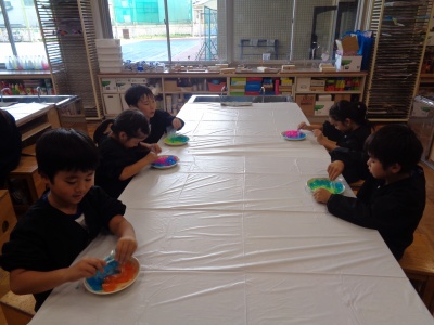 色を混ぜる中で「新しい色ができた!」と目を輝かせて報告してくれました。