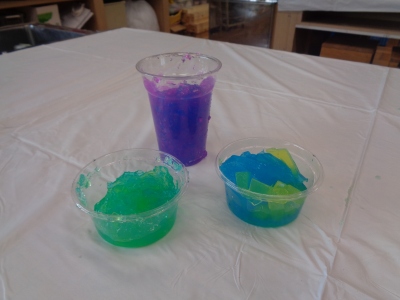 寒天と染料を混ぜて作った冷たいゼリーを使って、造形遊びをしました。
