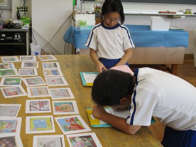 図工では、はじめに夏休みの作品の鑑賞をしました。