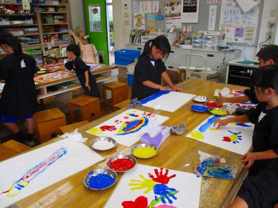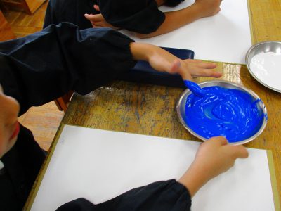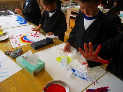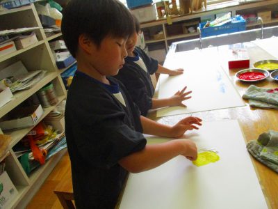 1年生の時にも使った、ねちゃねちゃ絵具を使って、手で絵具の感触を楽しみながら、自由に色をつけていきます。