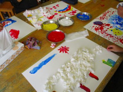 その後に、ティッシュを貼り付けて、その上から更に絵具を重ねて「でこぼこ」な画用紙を作りました。