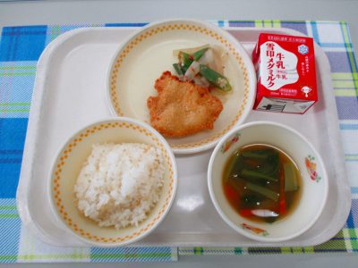 今日の献立は「とんかつ、オクラの梅おひたし、小松菜の味噌汁」でした。