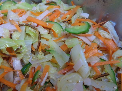 キャベツ、きゅうり、人参を合わせました。塩昆布の塩分やうま味が丁度よくて、ほかの調味料が少量で済みます。また、ごまとごま油がさらに風味をよくしてくれます。