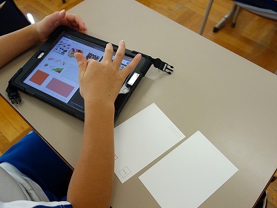 学活の時間を使って「絵手紙作り」に挑戦しました。夏休み前に見通しをもち、少し下絵も描きました。夏の思い出をふり返りながら、下絵のときとは、また違った絵にする児童も多くいました。そんなときはタブレットで写真などを見つけて参考にすると、表したいものが描きやすいようです。