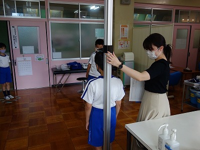 2学期最初の身体測定を行いました。少し大人っぽくなった雰囲気は感じるのですが、はたして長い夏休みの間に、身長や体重は変化しているでしょうか。成長のタイミングは人それぞれということもよくわかっているためか、それぞれの児童がにこやかに計測を受けていました。