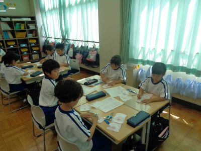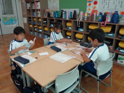 1学期末に、あさがおの色水遊びで染めた和紙を切り取って作りました。