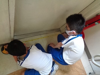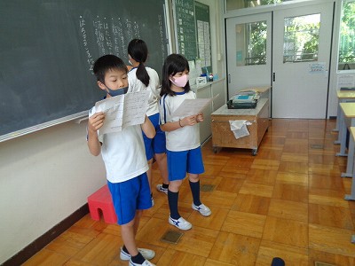 算数は、長さの学習です。巻き尺の使い方にさらに慣れるべく、教室や廊下の色々な長さをペアで測りました。
