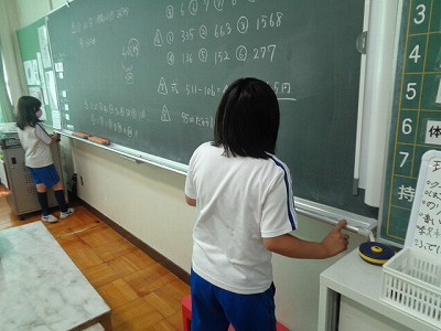 「測る前に、必ず長さの予想をしてから測る」がポイントです。正確に測るために、0を合わせること、まっすぐ測ることをしっかり心がけられていて、「ピンと持って!」「まっすぐにしよう!など声を掛け合ってペアで測れていました。