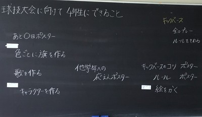1時間目は学級活動です。今日は、2学期の全校目標である「心を合わせ、力を合わせ、行事を創り出そう」という目標をもとに、10月に行われる球技大会に向けて、4年生にどんな事ができるかを話し合いました。「旗をつくる」や「応援ソングを作る」など、画期的なアイデアがたくさん出てきました。