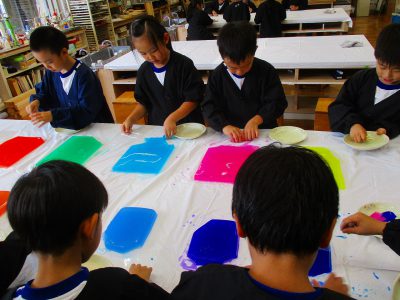 2学期はじめての図工は、湿度が高く、蒸し暑い今日にぴったりの題材「かんてんアート」です。