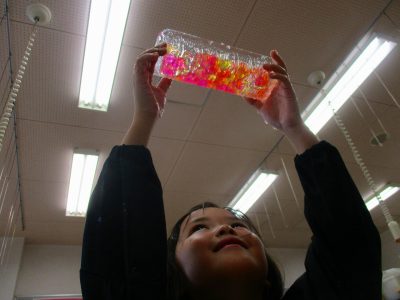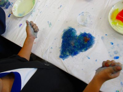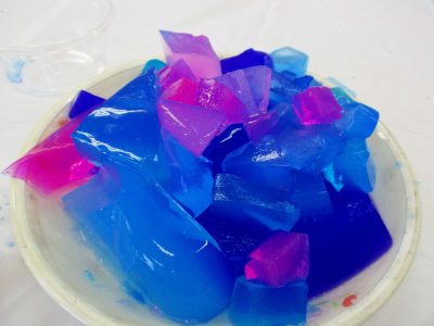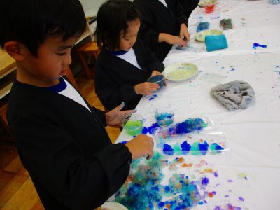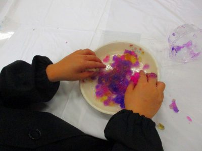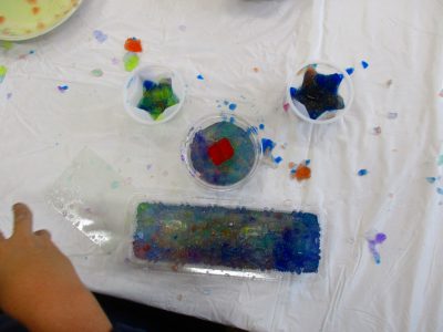 寒天と染料で作った大きなゼリーを使って、存分に造形遊びを楽しみました!