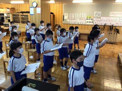 今日も、「♪マイバラード」の歌唱練習から始まりました。エンディングの学習では、「rit.=リット=リタルランド」の記号の意味を伝え、“テンポを落としてゆっくりと演奏する印”を表現するように、歌う練習を行いました。