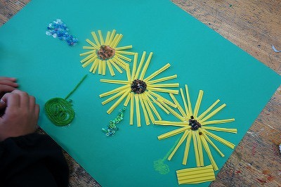 午後からは今週も図画工作の学習でした。材料の形や色,手触りなどからひらめいたものを絵に表していく活動の続きです。黄色のギザギザダンボールは,花びらになっていました。明るい黄色から花を思いついたようです。