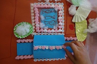 自分で準備したスポンジを模様にして並べて,中には魚を描いていました。この児童も色をきっかけにひらめいたようです。