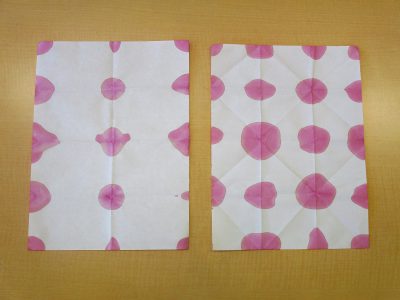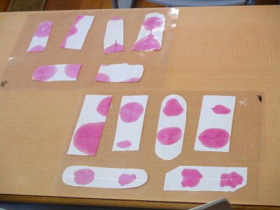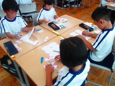 1学期末に、あさがおの色水遊びで染めた和紙を切り取って作ります。