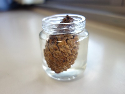 4校時の理科の学習が終わり、教室に戻ってきた児童の一人が、ずいぶん慎重に1つのガラスビンを持って帰ってきました。そばにいた児童にたずねると、理科の時間、校長先生にガラスビンに入ったまつぼっくりを見せていただいたようです。このまつぼっくりは大きくて、そのままではガラスビンの口から取り出すことができないサイズです。しかし、水を入れるとまつぼっくりが閉じて、なんと、いとも簡単に取り出せるというのです。