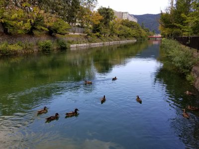 The ducks and coy-fish were swimming around in the canal outside our school today.