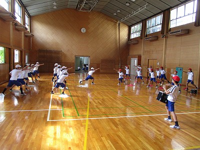 体育館で、威勢のいい声で、エール交換や拍子に合わせた応援練習をしています。