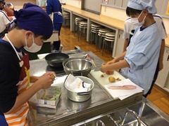 1学期の終わりに完成した“マイエプロン”を着用して、この実習に取り組んだ6年生の姿が多く見られました。